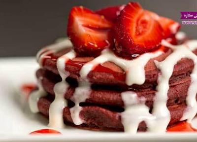 پنکیک رد ولوت یک کیک مخملی قرمز رنگی است، برای صبحانه وعده غذایی کاملی است که با ریختن پنیر خامه ای بر روی کیک، طعم بی نظیری به خود می گیرد.