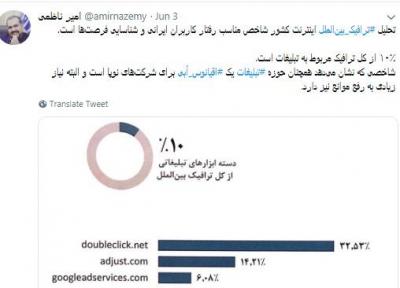 امیر ناظمی، رئیس سازمان فناوری اطلاعات در صفحه کاربری خود در توئیتر اظهار داشت: 10 درصد از کل ترافیک بین الملل اینترنت ایران، مربوط به تبلیغات است و تبلیغات آنلاین می تواند کسب و کارهای نوپا را متحول کند.